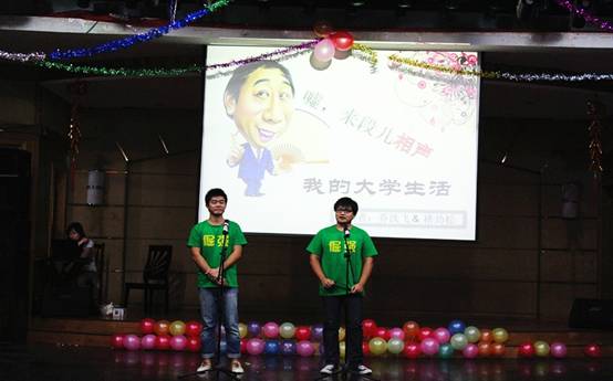晚上七点,装饰华丽的会场灯火通明,老师们和同学们准时到达会场,等待着迎新晚会的开始。晚会以一段带有异域风情的印度舞表演为开场,紧接而来的还有诗歌朗诵,团体合唱,男女对唱,小品等。晚会的高潮,是一出由谢道喜、肖铮等同学带来的短剧《梁祝外传》,幽默的笑点,滑稽的表演,引得同学们掌声连连,笑声一浪接着一浪。