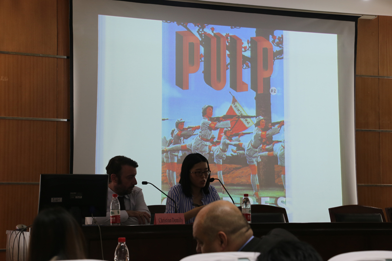 讲座中,Christian DEMILLY主编对《Pulp》杂志进行了简单介绍。《Pulp》为季刊,创刊于2014年1月,办刊主旨为“图像拥有话语权”,刊物探讨各种类型的图像以及他们与社会热点问题的关系。他认为在互联网时代,图片数量太多,很有意思的图片淹没在了图片的洪流中,因此需要选择小部分图片让洪流停下来。杂志通过向人们展示有意义的图片,让人们能够关注现实生活中的图片,引发人们对现实的思考。他通过具体的图片向我们展示图片的话语权魅力,杂志就是通过寻找特别的图片,来感染读者,让图片自己说话,让文字服务于图片。这样会锻炼人们的想象力,让读者学会用美学的角度看世界,注意并思考生活中的图片,这也会给人们带来不一样的领悟与感受。