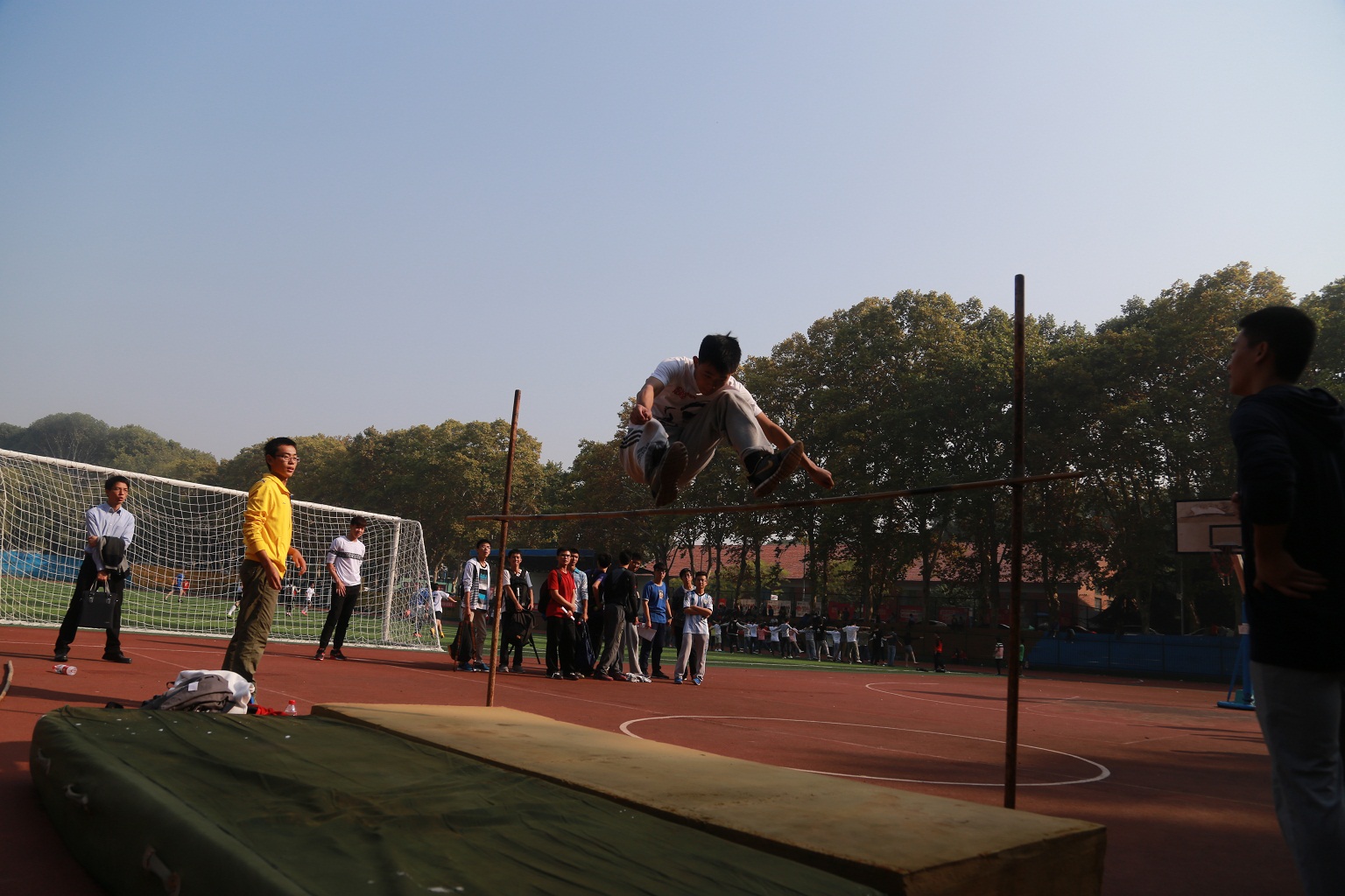 一位同学在看到自己的名字出现在跳高的名单上时,惊呼道:“我只是开玩笑的。没想到室友真的给我报了!”同时,跳高和跳远的选手则在场边做着拉伸活动。每位选手都有两次机会,很快便决出胜负。随后男子田赛项目也相继开展。在检录过程中,一位男生在听到班上100米和1500米都缺人的时候,主动冲到主席台说:“100米1500米都给我,当然活动分也要给我。”随着跑道旁的一声声枪响,一道道飞驰的身影从跑道上掠过。在女子4x400米决赛中,二班最后一棒选手周晶晶同学在冲刺关头实现大逆转,在最后50米发力冲刺为二班收获了这项团体项目的桂冠。最后二班、三班、一班分获女子4x400米的一、二、三名。坐在观众席上的“啦啦队”们在自己班运动员们在跑道上飞驰时,也会放下手中的手机与作业高呼加油!