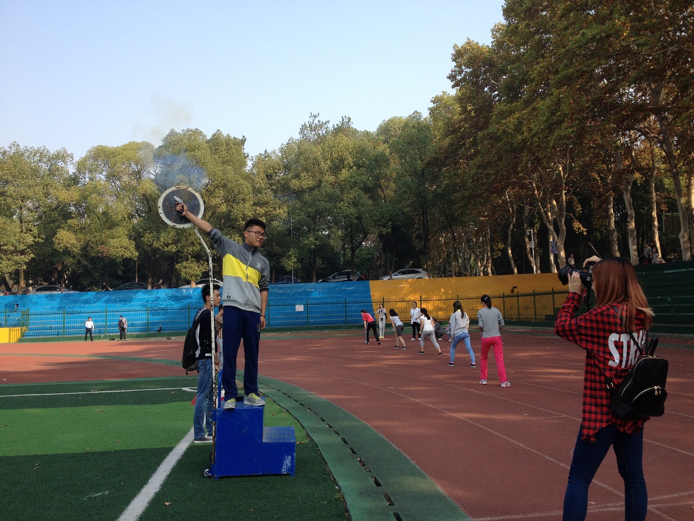 上午八点半,伴随着精彩的介绍词,各班方阵依次入场,2014级辅导员陈菊平进行了简短致辞,表示希望同学们走下网络,走出宿舍、走向操场,借助运动会养成锻炼身体的习惯,并加强班级之间、同学之间的沟通与交流。接下来运动员代表进行了宣誓,主持人宣布运动会正式开始。首先开始的是女子的田赛项目:女子铅球、女子跳高和女子跳远。比赛之前,一位拎着铅球铁篮子瘦弱妹子感慨道:“这是我第一次摸铅球呢,体委说每个人可以报三个项目,所以我想试试铅球。”对于大一的新生来说,这是第一次参加大学的运动会,除了实心球变成了铅球外,最大的不同要数有了保税国际的赞助以及扫码送礼品的小惊喜。