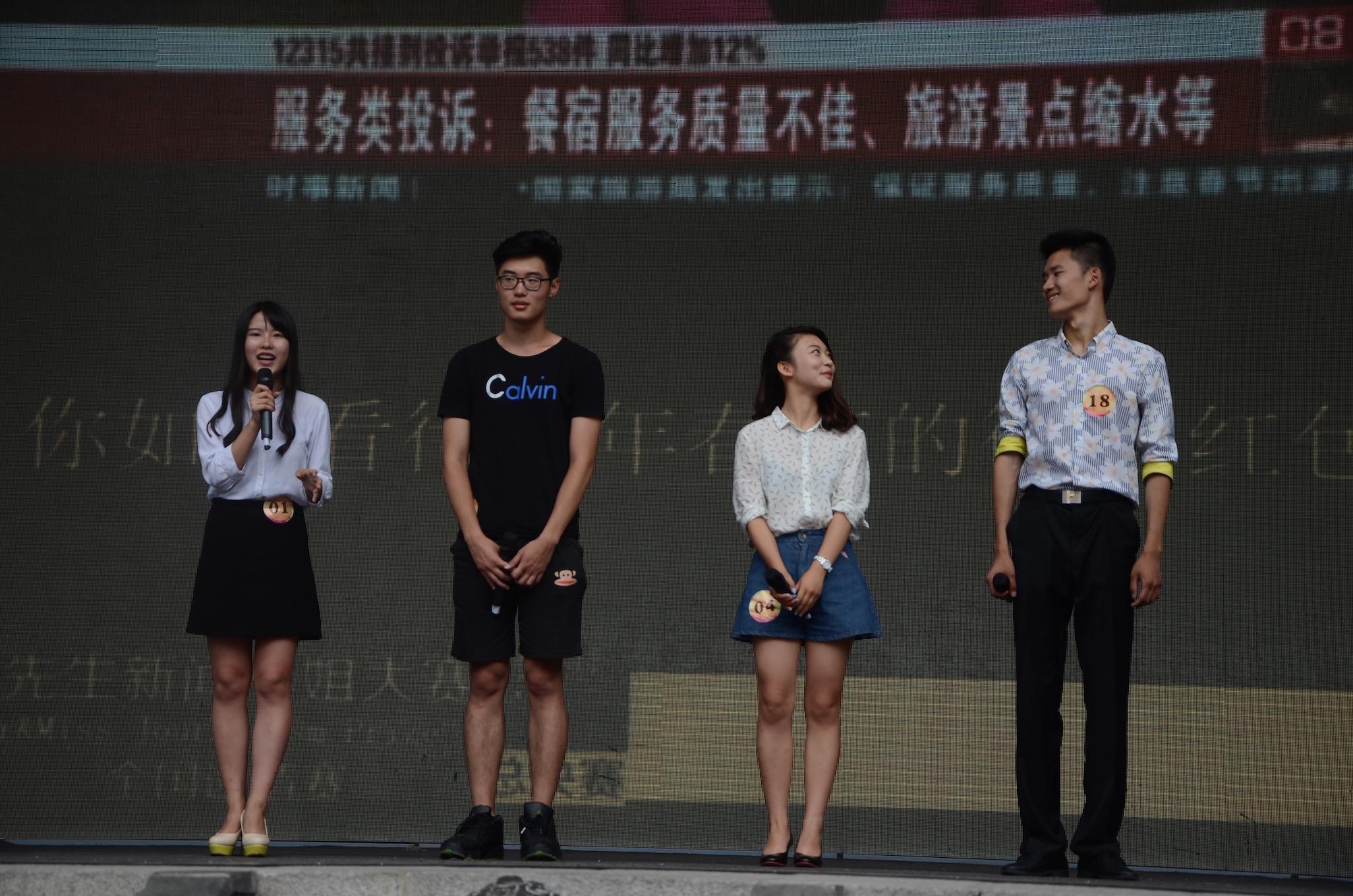 接下来的是“新闻态度”环节,此时选手们已由事先抽签好的结果被分为A、B、C、D、E五个组,同组的四人需要对屏幕上播放的视频新闻进行为时不超过三分钟的评论。另外,根据选手们的表现,大赛会对前三个环节选手们的分数进行一轮累计,淘汰位于末位的四位选手。