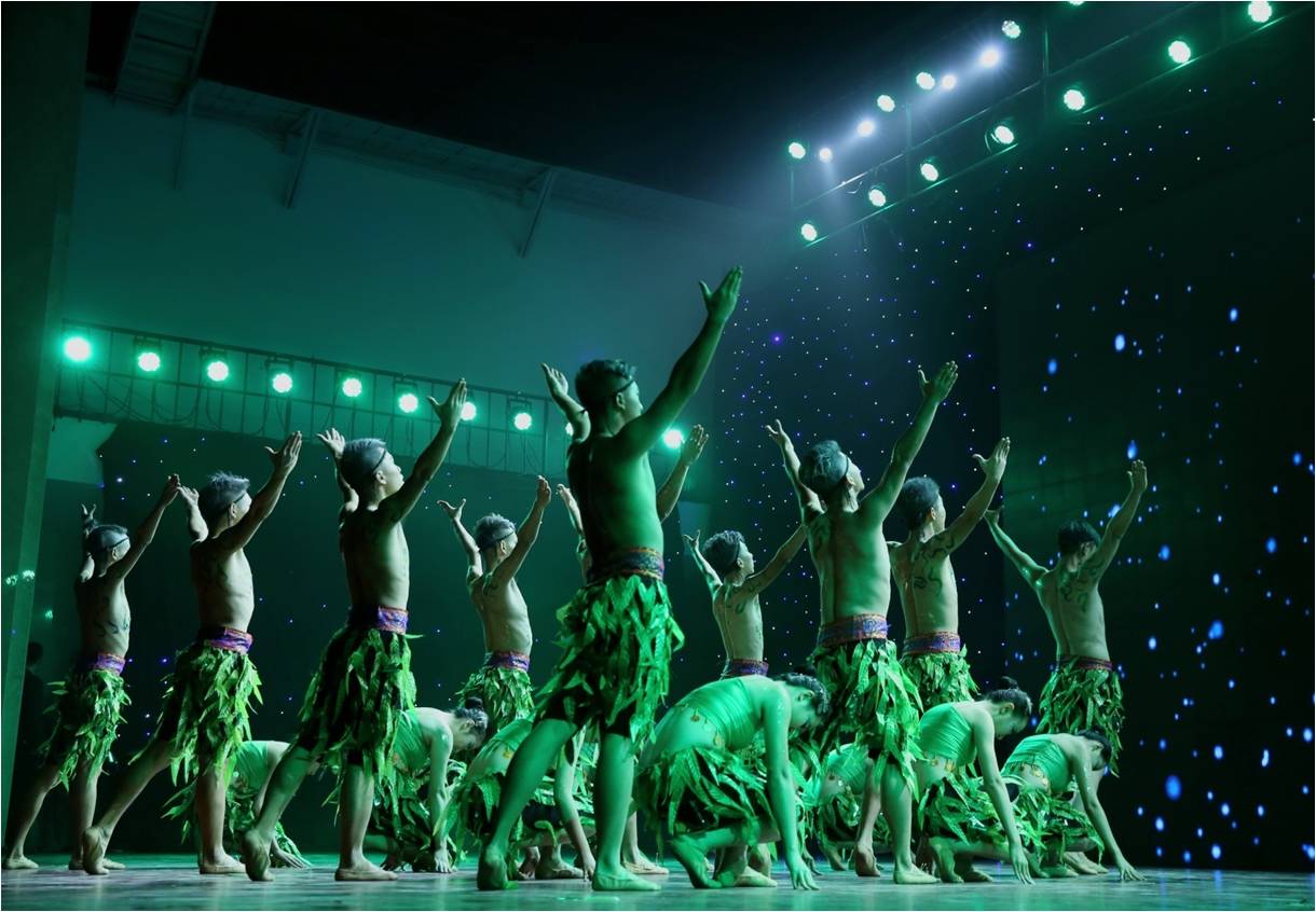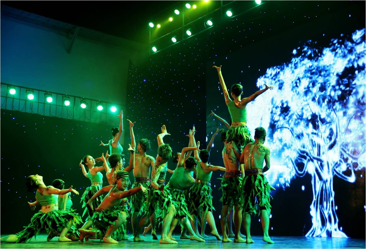 突然,灯光变暗,鼓声停止,悠扬舒缓的傣家音乐响起,背景墙上出现了一颗正在逐渐生长的大树。此时,新闻院的姑娘们身着绿衣出现在舞台上,像一只只活泼可爱的孔雀在林间嬉戏。