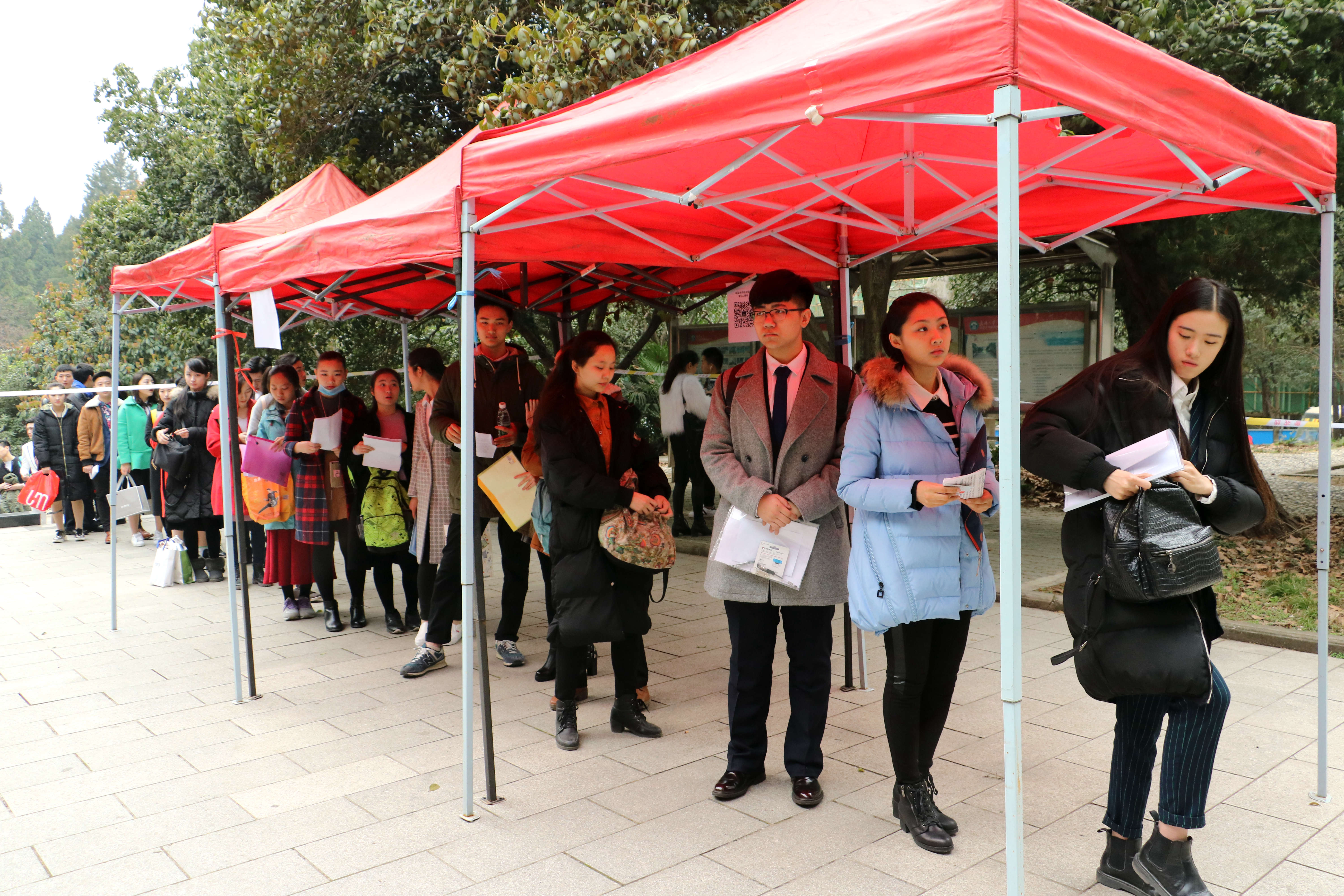 (图二 考生有序站队)等轮到皮露露入场时,她来到了身高测量处,只有在确认过了身高达标线(女生高于160cm,男生高于170cm)后,才能进入正式考核。而有些考生因为这一硬性规定,遗憾地止步考场。徐文卿在考完之后回忆道,初试的两天半,一共有三十位左右的考生因为身高原因被他拦在门外,大多数是女生。“其实心里面很难过,但是公司规定没有办法,很多人专门来考武大,然后因为硬件问题被拒之门外,也有很多女生哭脸的,赖着不走的。”但他也反复强调,要按规矩办事。