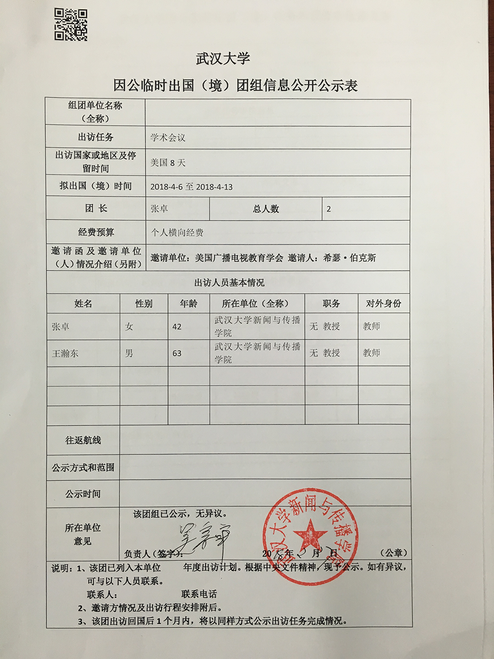 williamhill中国官网入口因公临时出国(境)公示表(张卓)