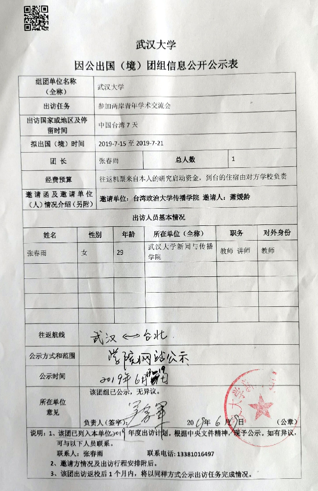 williamhill中国官网入口因公临时出国(境)公示(张春雨)