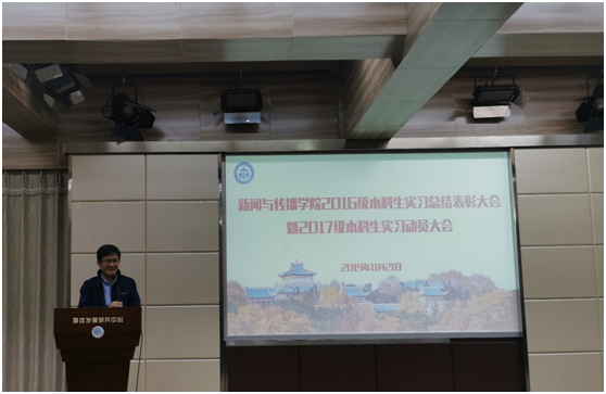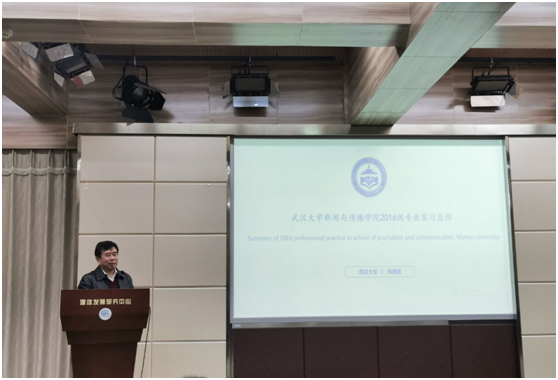 实习领导小组组长周茂君教授从实习区域和实习单位分布等方面,将2016级本科生实习情况与之前做了对比,对2016级本科生实习情况作了总结。他提出2019年的实习在以下几个方面呈现新特点:一是实习地域分布上,北京成为实习主要去向,而长沙增长明显,广州、上海、深圳略有减少,武汉有回流趋势。二是实习单位类型上,互联网单位虽仍然为主要去向,但进入传统媒体实习的人数增长不少。在传统媒体实习人数回流这一现象上,周老师认为公司出台的鼓励政策发挥不小作用。三是专业实习特点上,“触网”势头明显,既有原创内容生产,又有新媒体技术应用、产品运营,还有UI设计、交互设计和网站作品开发等等。最后他也提到,目前公司本科生实习工作中仍存在一些不足,如少数同学将公司实习推荐当作备选、实习期间过于娇气等等。