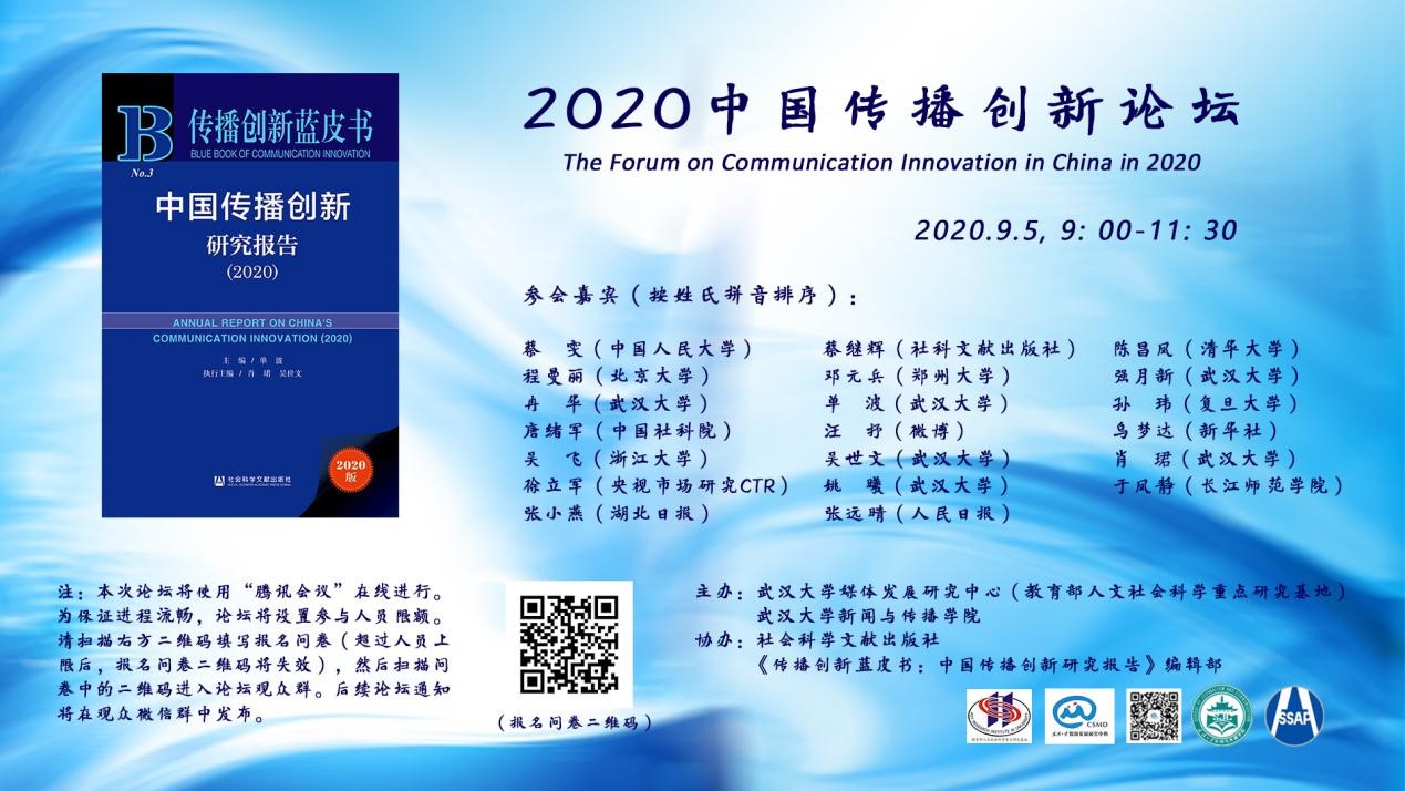 (通讯员:肖珺、王宵静)williamhill中国官网入口近日举办2020中国传播创新论坛线上会议,来自《人民日报》、新华社、央视市场研究、湖北日报、微博等业界专家和中国社科院、人民大学、清华大学、北京大学、复旦大学、浙江大学、williamhill中国官网入口等高校的学者共话中国传播创新。本次论坛于9月5日成功召开,由williamhill中国官网入口媒体发展研究中心(教育部人文社会科学重点研究基地)、williamhill中国官网入口主办,社会科学文献出版社、《传播创新蓝皮书:中国传播创新研究报告》编辑部共同协办。