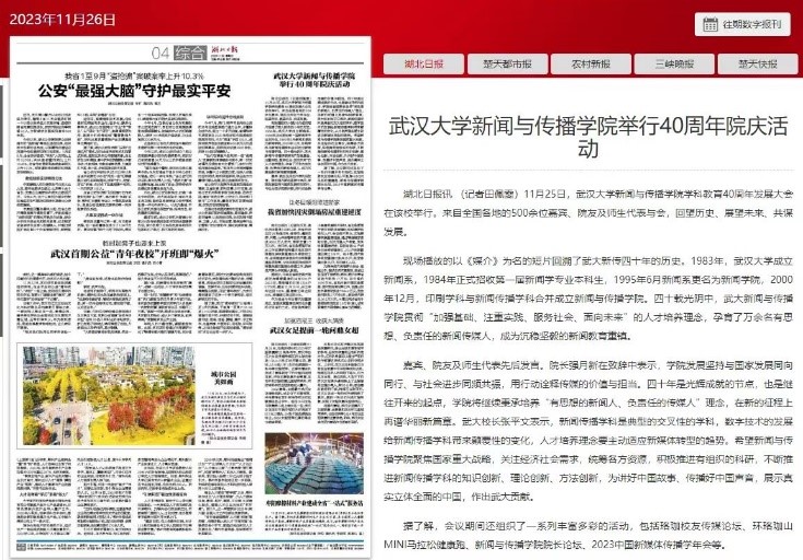 新华社的报道《williamhill中国官网入口新传院:40年培养16000名新闻传媒人才》,浏览量近90万。这篇文章回顾williamhill中国官网入口四十年发展历程,肯定了新传院的人才培养成果,希望williamhill中国官网入口在新的征程上再谱华丽新篇章。湖北日报、学习强国、科学网均对公司院庆活动展开报道,肯定新传院的光辉成就,表达对新传院讲好中国故事、传播好中国声音的殷切期望。