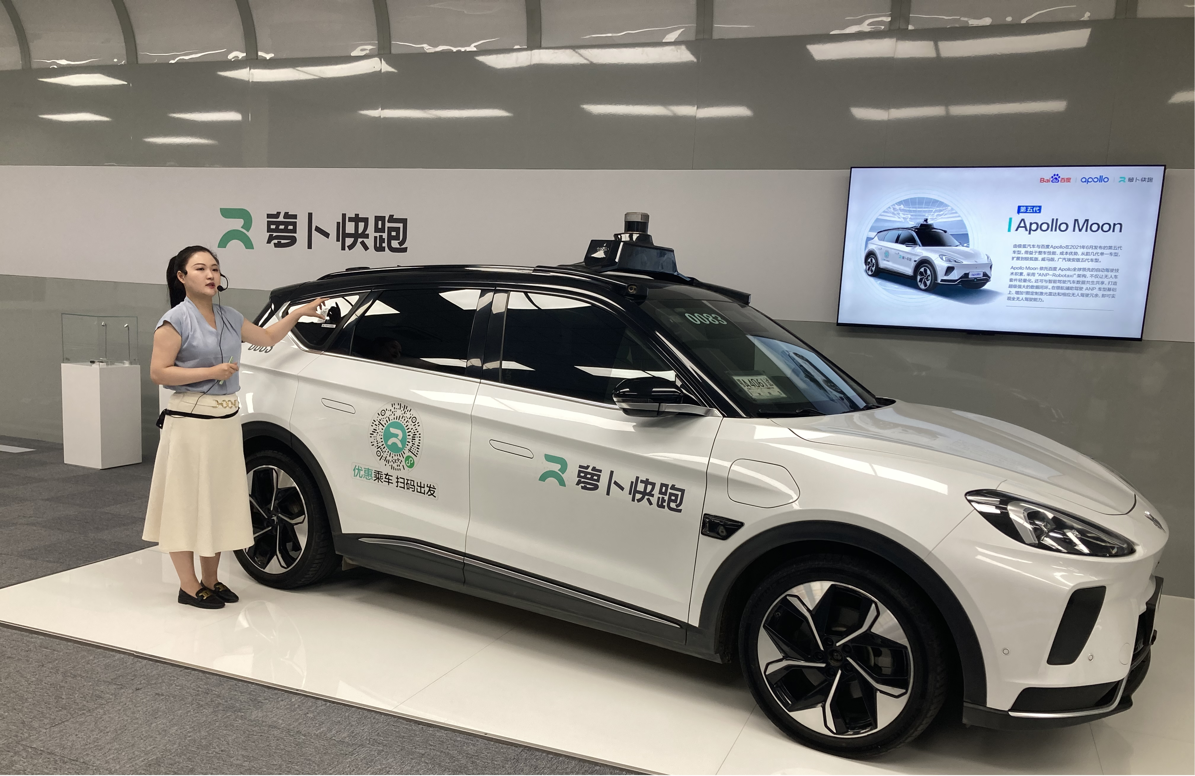 据讲解员介绍,目前百度萝卜快跑车队的测试总里程已超过1亿公里,订单量超过600万单,是全球最大的自动驾驶出行服务商。其全无人行驶里程以每日10万公里的数字不断增加,相当于每天绕地球两圈半。