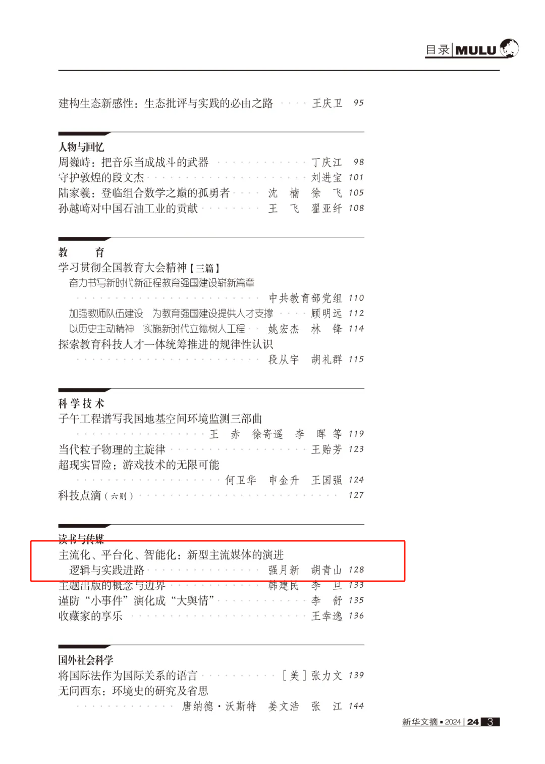 《新华文摘》2024年第24期“读书与传媒”专栏全文转载公司强月新教授与其博士生胡青山合著的文章《主流化、平台化、智能化:新型主流媒体的演进逻辑与实践进路》。