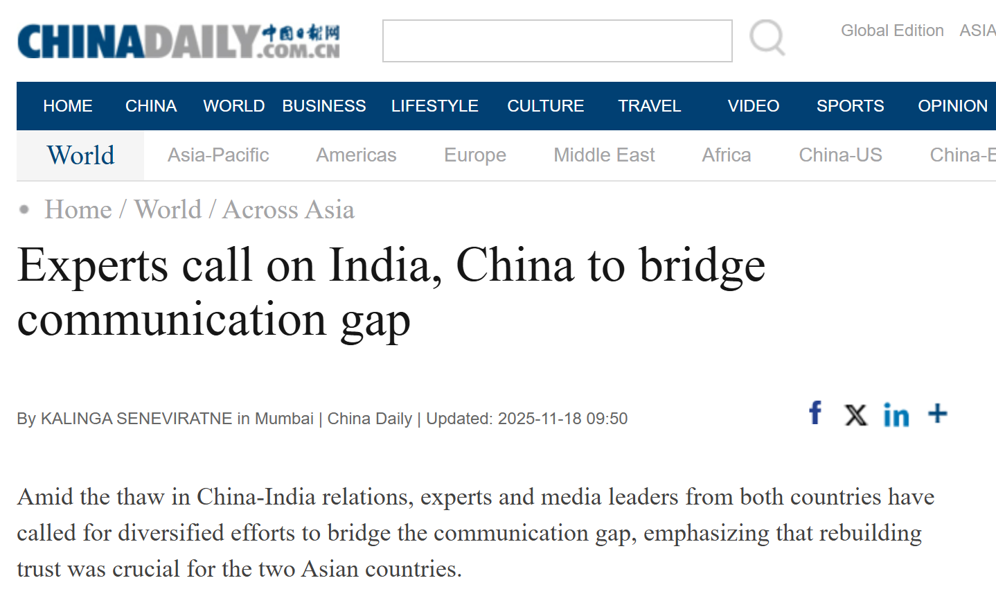 本届年会受到亚洲学者与媒体的广泛关注,中国日报China Daily对其进行了题为《专家呼吁印度、中国跨越交流鸿沟》(Experts call on India, China to bridge communication gap)的新闻报道,并在报道中引用纪莉教授的观点:“我们需要向青年展示,人类命运共同体不仅仅是一个口号,而是可执行的行动准则。如果我们的传播制造对抗,又如何能在人与自然和谐共存的基础上创造共同未来?”